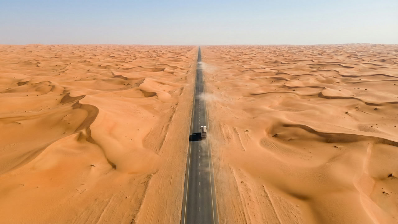 A Highway 10 corta o Rub al-Khali, que em árabe significa “Quarto Vazio”. Com cerca de 650 mil km², esse deserto ocupa o terço sul da Península Arábica e é o maior mar contínuo de areia do planeta. Suas dunas atingem até 250 metros de altura, e a areia tem tonalidade alaranjada por causa da presença de feldspato no solo.