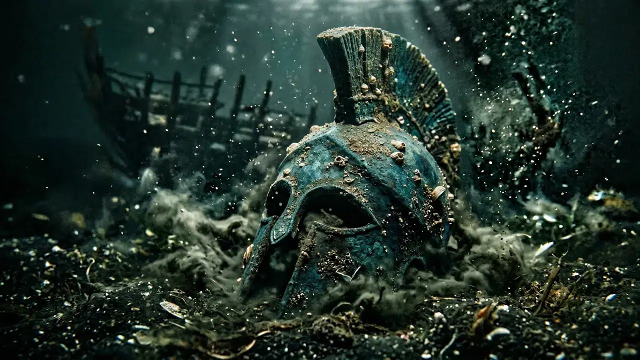 Capacete espartano submerso sendo coberto pelo lodo marinho (imagem ilustrativa)