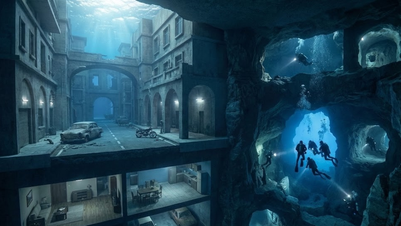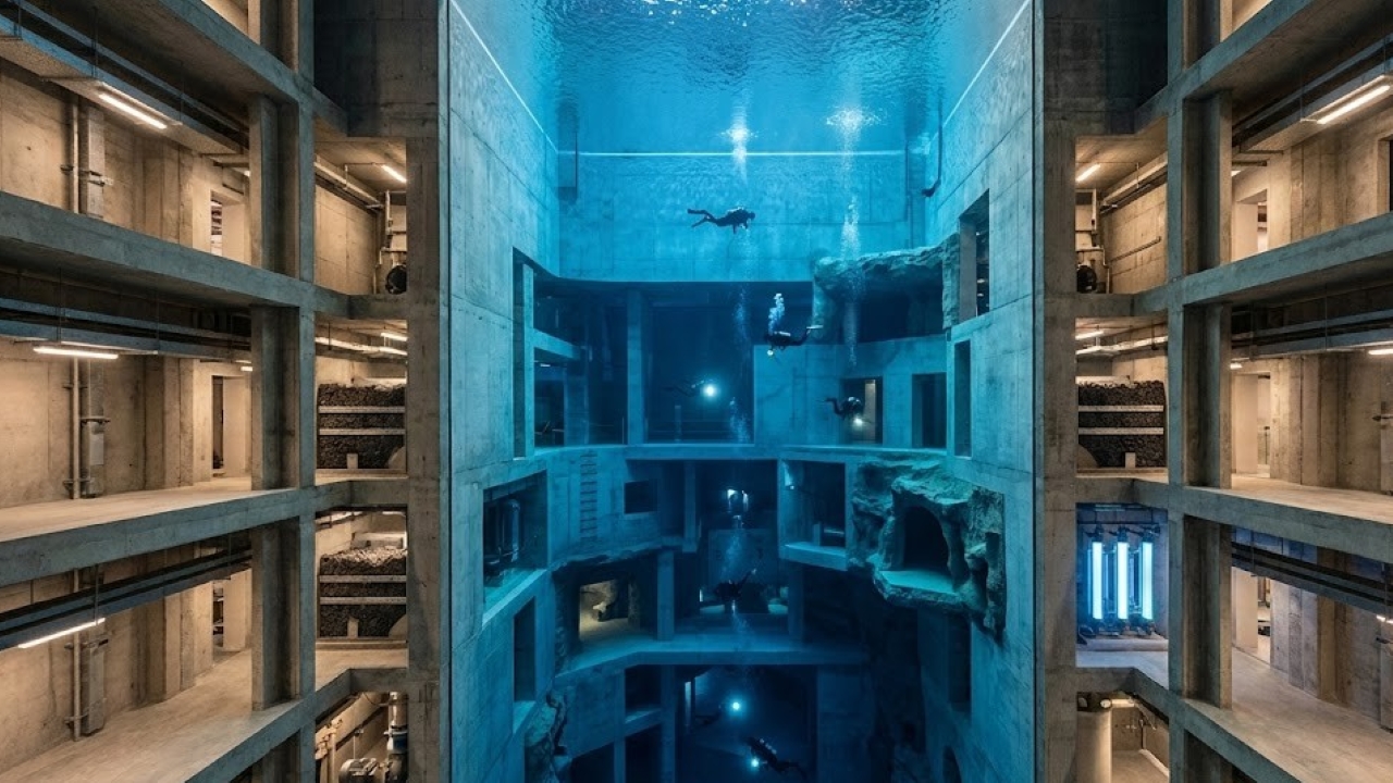 A grande atração do complexo não é apenas a profundidade, mas o que foi construído lá dentro. Diferente de piscinas olímpicas com azulejos azuis monótonos, os projetistas criaram uma cidade submersa pós-apocalíptica. À medida que o mergulhador desce, ele encontra ruas abandonadas, um apartamento mobiliado, garagens com carros e motos, e até uma área de jogos com pebolim e sinuca.