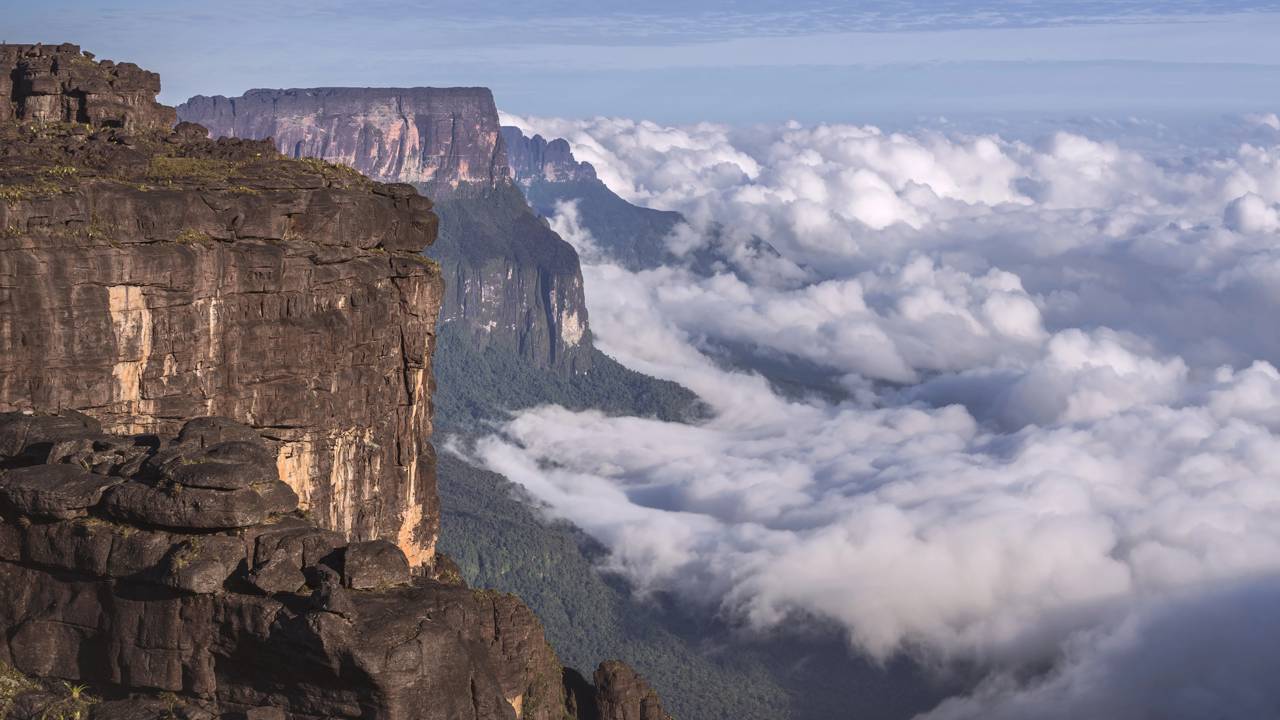 O Roraima é o mais famoso deles. Seu topo plano de aproximadamente 31 km² funciona como uma ilha biológica. O isolamento permitiu que espécies evoluíssem de forma independente: o sapinho preto Oreophrynella quelchii, que não salta, e diversas plantas carnívoras adaptadas ao solo pobre em nutrientes existem apenas aqui. O platô inspirou Arthur Conan Doyle a escrever O Mundo Perdido em 1912 e a Pixar a criar cenários de Up: Altas Aventuras.