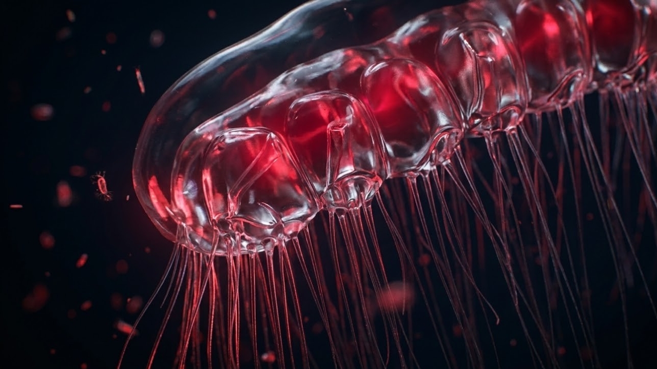 Essa maior criatura marinha possui um corpo gelatinoso e translúcido que brilha na escuridão total das profundezas. Diferente da maioria dos seres abissais que brilham em tons de azul ou verde, muitos sifonóforos do grupo Apolemia emitem uma luz vermelha rara para atrair suas presas para a morte.