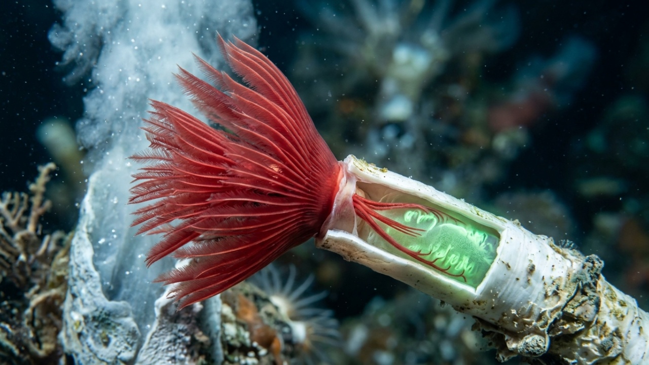 O organismo mais emblemático dessa adaptação extrema é o verme-tubo gigante, registrado pelos catálogos científicos como Riftia pachyptila, que chega a medir extraordinários 2,4 metros de comprimento. Segundo os estudos genéticos sobre ecossistemas extremos, esse animal curioso sequer possui boca ou sistema digestivo, dependendo absolutamente de bilhões de bactérias simbiontes abrigadas em seu órgão interno exclusivo, o trofossoma.