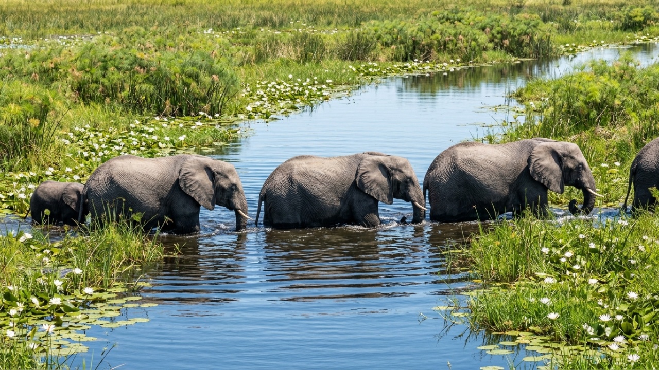 • Elefantes e hipopótamos, que usam os canais como rotas de deslocamento e fonte de alimentação