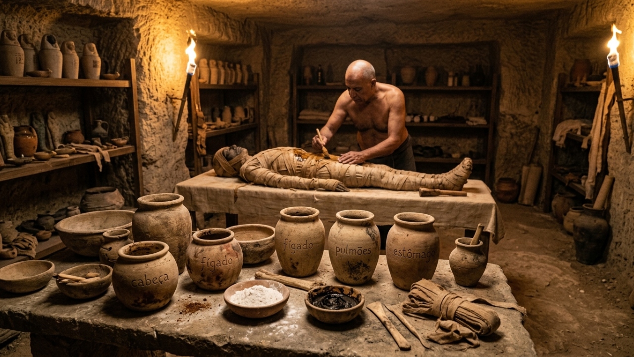 A descoberta de uma oficina de mumificação em Saqqara revelou que o embalsamamento egípcio era muito mais do que um ritual espiritual. Era uma operação química globalizada, com fórmulas precisas e ingredientes vindos de continentes distantes, desenvolvida há 2.500 anos.