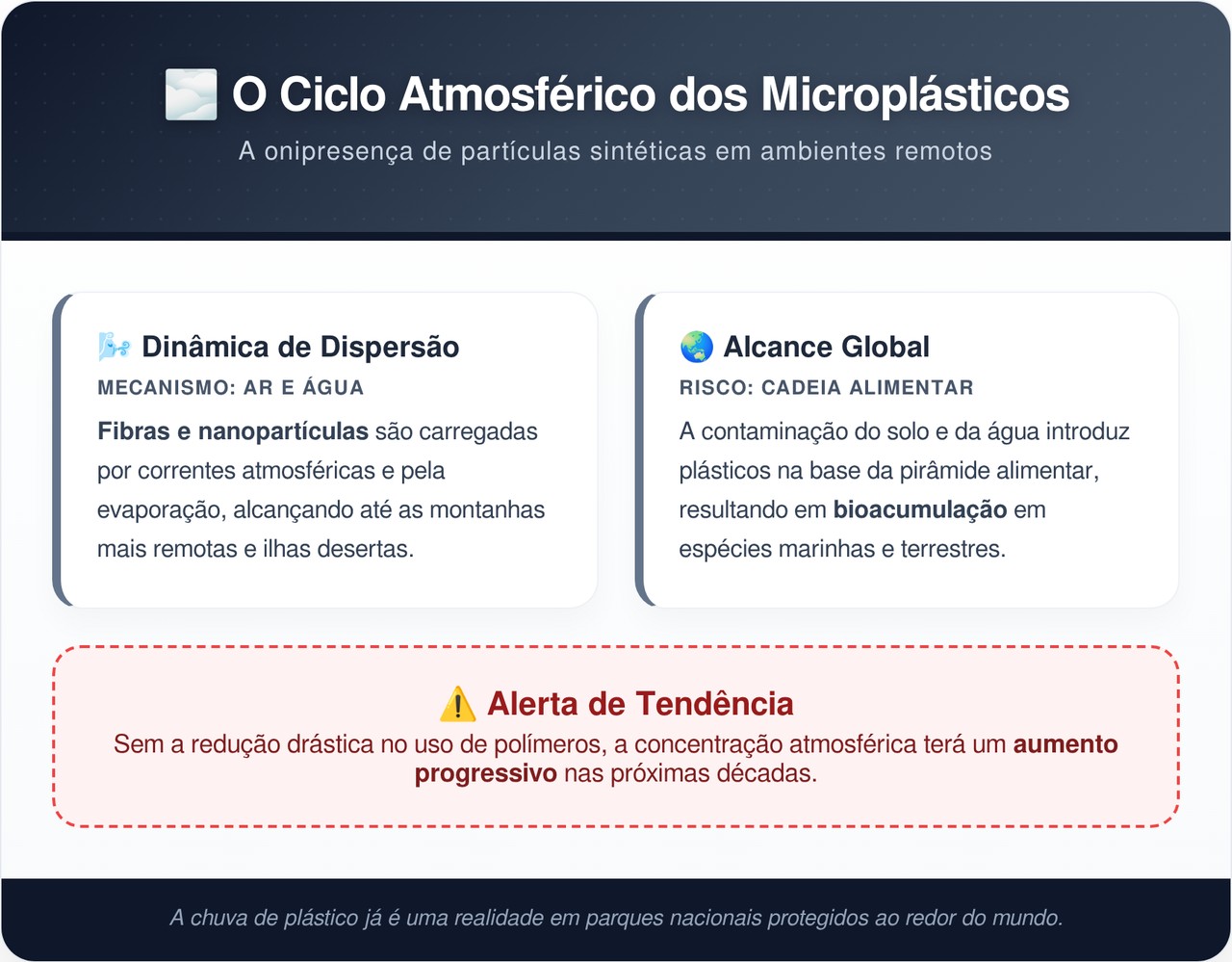 A confirmação de que está chovendo microplásticos na Terra acendeu um alerta global. Análises atmosféricas recentes revelaram que fragmentos minúsculos de plástico evaporam com a água, viajam pela atmosfera e retornam ao solo pela chuva, atingindo até regiões remotas e montanhas de grande altitude, sem exceção.