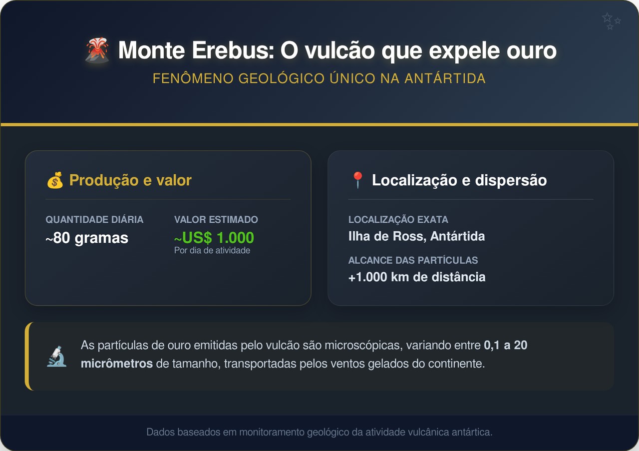 O Monte Erebus não é uma lenda — é um vulcão ativo no fim do mundo que expele ouro real para a atmosfera todos os dias. O fenômeno desafia a imaginação e revela como a natureza ainda guarda segredos preciosos sob o gelo eterno da Antártida.
