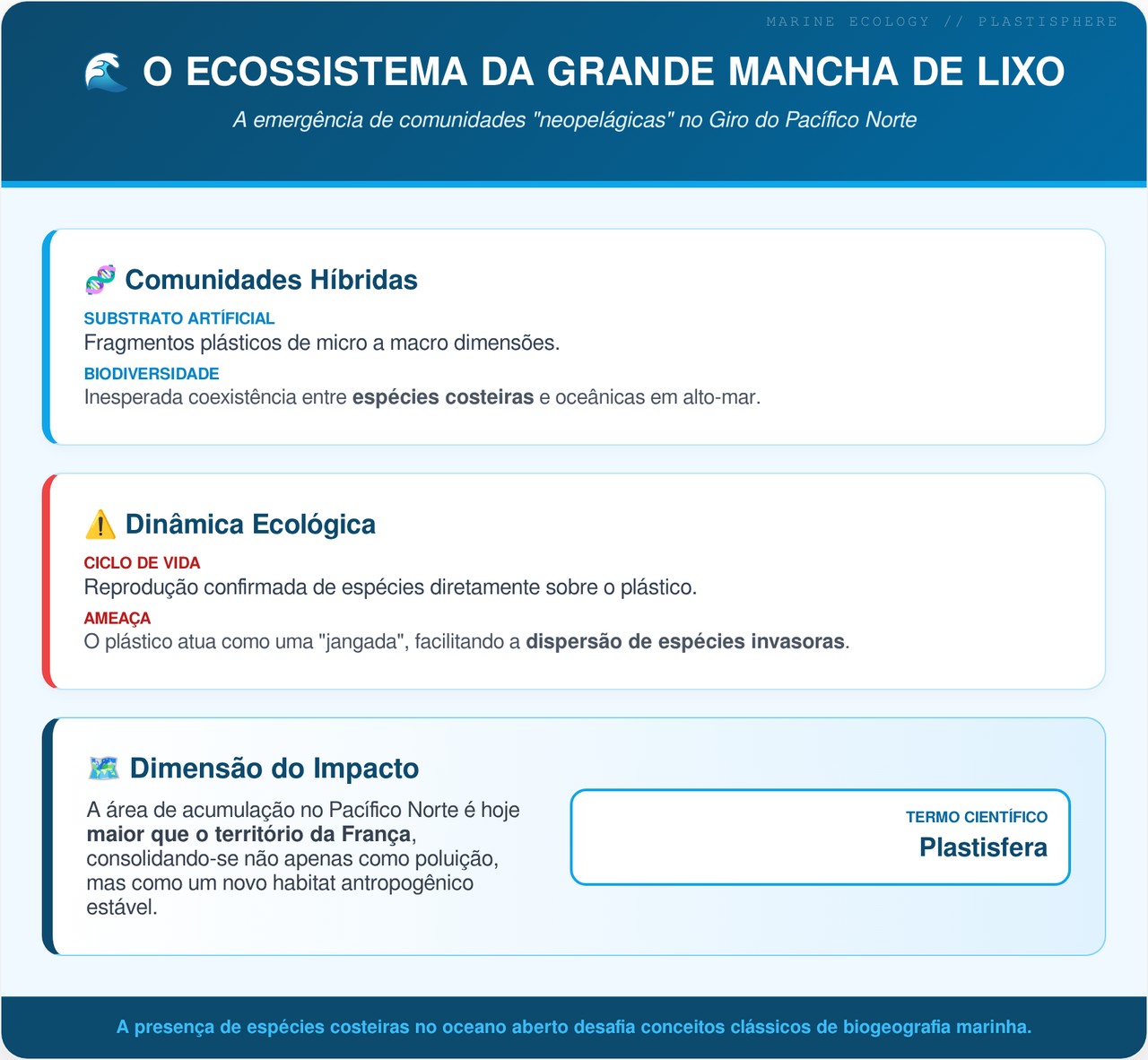 No meio do Oceano Pacífico, entre a costa da Califórnia e o Havaí, uma gigantesca área de plástico flutuante deixou de ser apenas um símbolo de poluição para revelar algo inesperado: um novo tipo de ecossistema oceânico. A Grande Mancha de Lixo do Pacífico agora abriga espécies costeiras e de mar aberto vivendo e se reproduzindo juntas sobre o lixo humano.