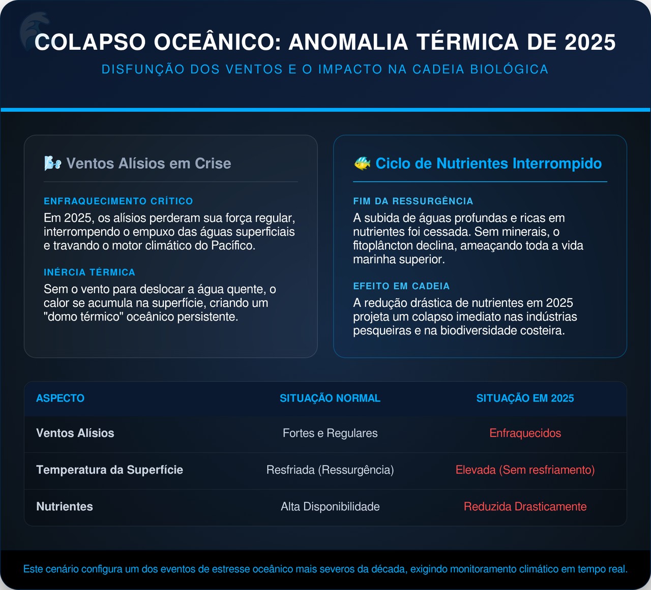 A tabela abaixo compara o comportamento normal da ressurgência com o que foi registrado em 2025:
