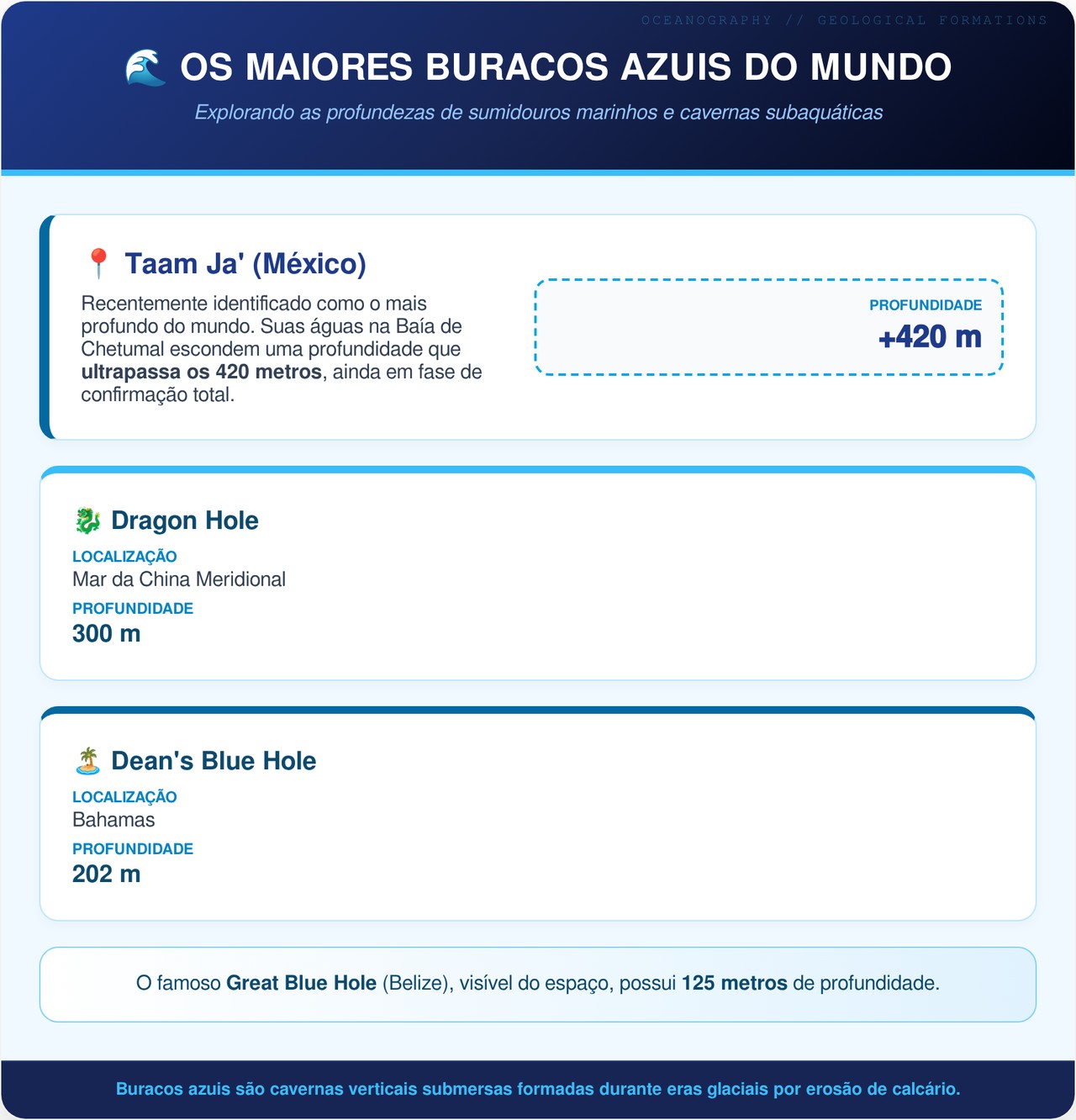 O Taam Ja’ superou o Dragon Hole, no Mar da China Meridional, tornando-se o buraco azul mais profundo já registrado no mundo. As medições ultrapassam os 420 metros abaixo do nível do mar, e o fundo ainda não foi alcançado pelos instrumentos atuais.