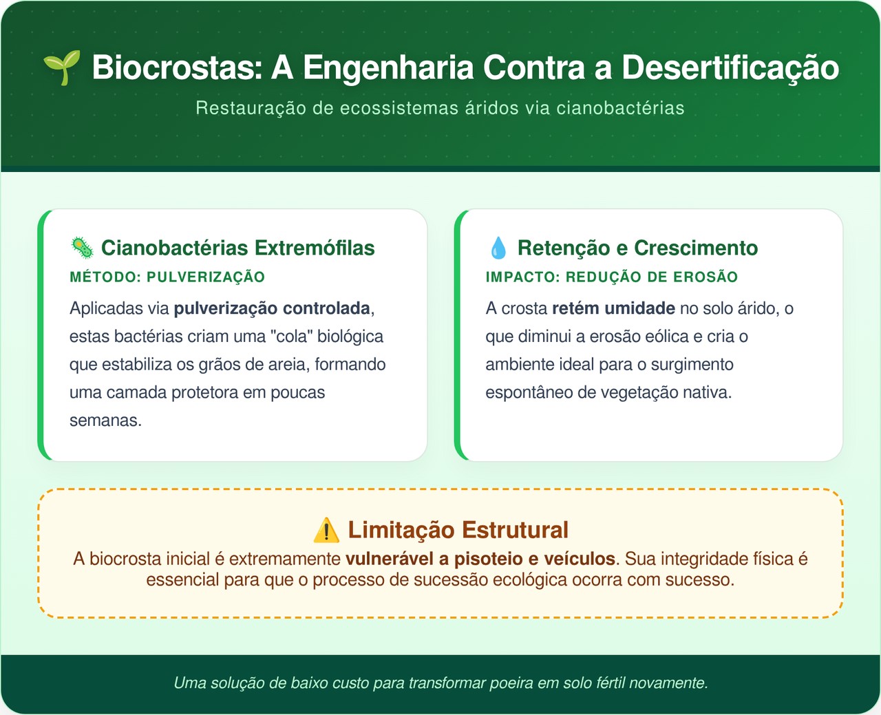 As cianobactérias formam crostas biológicas que grudam os grãos de areia, criando uma superfície estável que impede erosão, retém umidade e permite o crescimento de outras formas de vida. Mesmo em ambientes extremamente secos, elas usam a luz solar para produzir energia e iniciar a recuperação do solo.