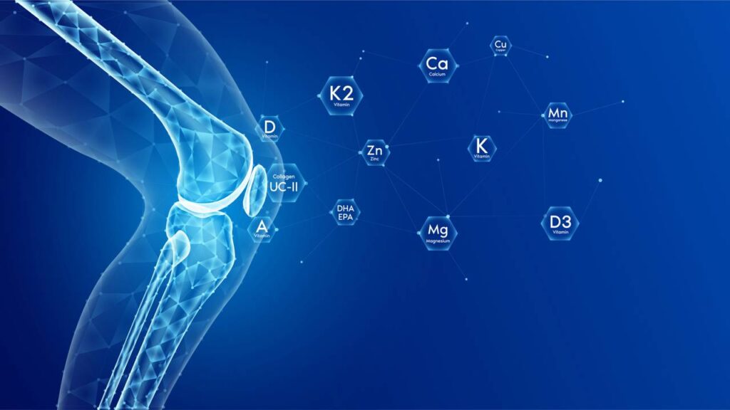 Triângulos translúcidos de baixa resolução representando a lateral de um osso da perna sobre um fundo azul, com vitaminas e minerais como cálcio, zinco e magnésio absorvidos pela cartilagem óssea e cuidando da articulação do joelho – Créditos: depositphotos.com / [email protected]