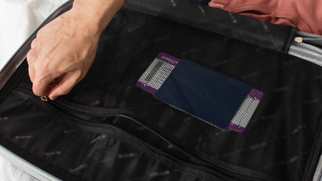 Imagem recortada de um homem fechando o zíper de uma mala com o passaporte dentro, sobre a cama – Créditos: depositphotos.com / Ischukigor