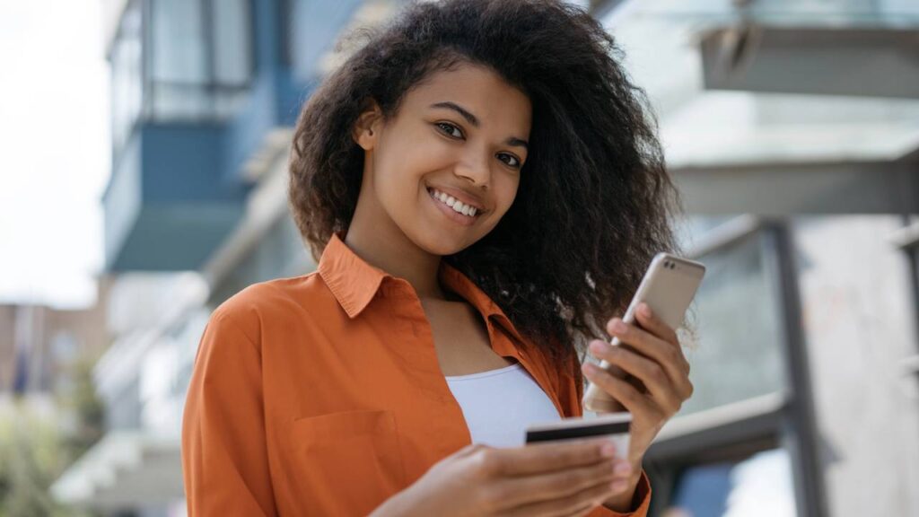 Mulher afro-americana segurando cartão de crédito, usando smartphone com aplicativo para compras online com preços baixos e cashback. Garota hipster feliz pedindo comida online, realizando transação – Créditos: depositphotos.com / Oleksii.Didok