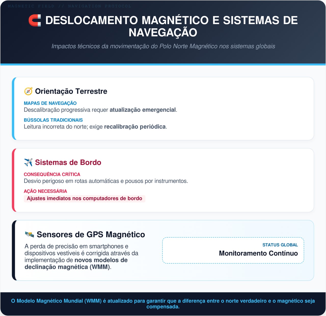Essas atualizações emergenciais já foram realizadas nos últimos anos para manter a segurança dos sistemas que dependem do norte magnético.