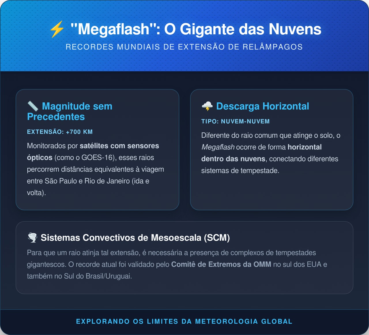 Um mega-relâmpago de 700 km foi registrado por satélites meteorológicos e validado oficialmente pelo Comitê de Extremos Climáticos da Organização Meteorológica Mundial (OMM), redefinindo o que a atmosfera terrestre é capaz de produzir. O evento abriu novas discussões sobre segurança, clima extremo e a tecnologia necessária para detectar fenômenos dessa escala.