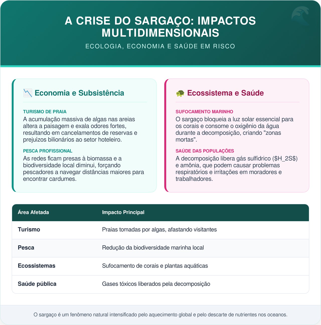 Quando o sargaço encalha nas praias, ele se decompõe liberando sulfeto de hidrogênio, gás de odor forte que causa irritações em humanos e animais. O problema vai além do cheiro e afeta diretamente a economia e o meio ambiente local.
