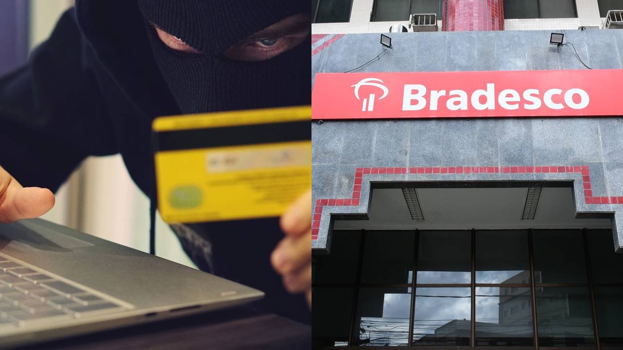 Homem mascarado usa internet, conta bancária e linhas de crédito. Ataque de phishing realizado por homem com o rosto coberto e Agência bancária Bradesco - Créditos: depositphotos.com / casadaphoto - Créditos: depositphotos.com / [email protected]