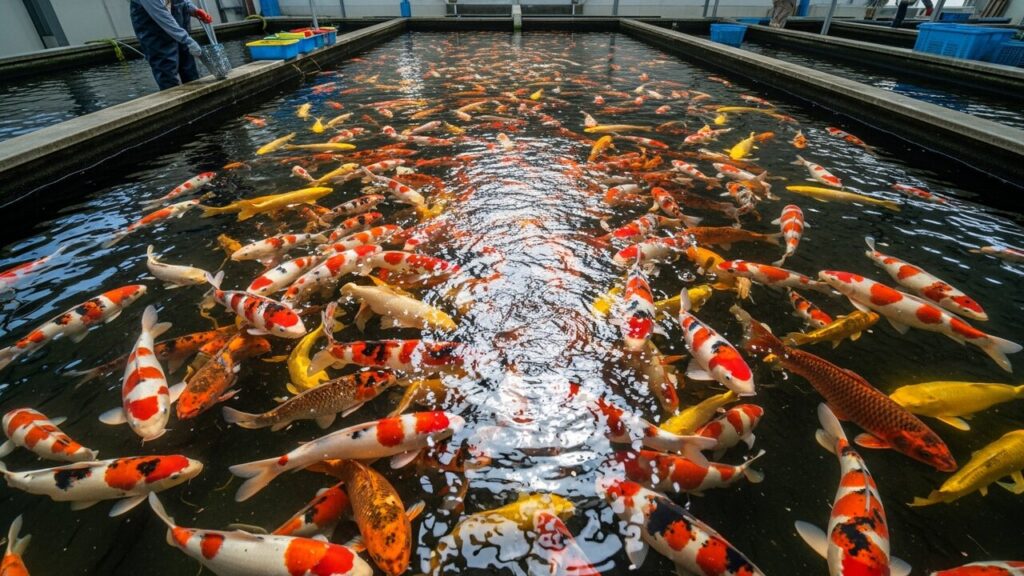 A escala da produção é impressionante: uma única desova pode gerar de 2 a 3 milhões de alevinos, dos quais apenas uma pequena fração passará pelas sucessivas etapas de seleção. No primeiro ano, as carpas selecionadas já atingem cerca de 30 centímetros, crescendo em imensos lagos nas montanhas do Japão.