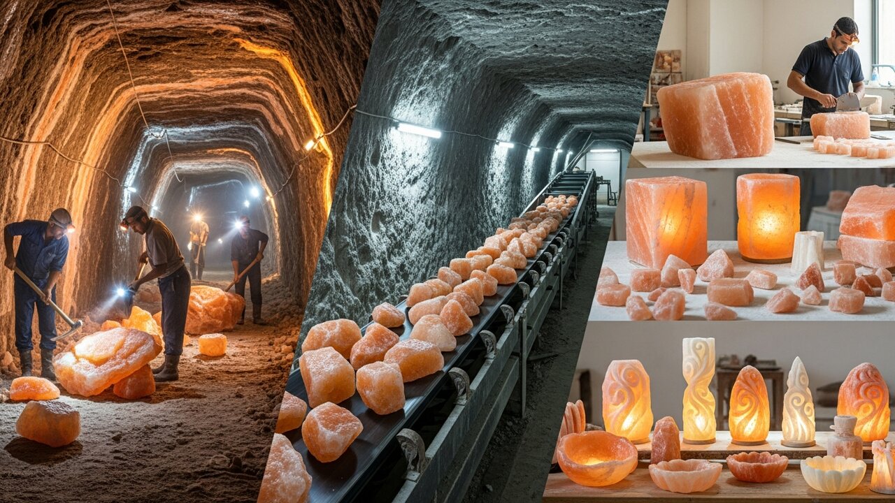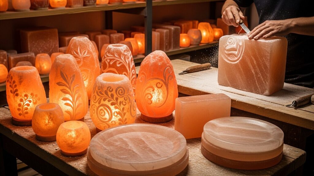Para as famosas lâmpadas, artesãos habilidosos moldam os blocos e perfuram um centro para a passagem da luz. Cada peça é entalhada manualmente, resultando em um design único que valoriza a beleza natural da rocha de sal, transformando-a em um objeto de decoração.