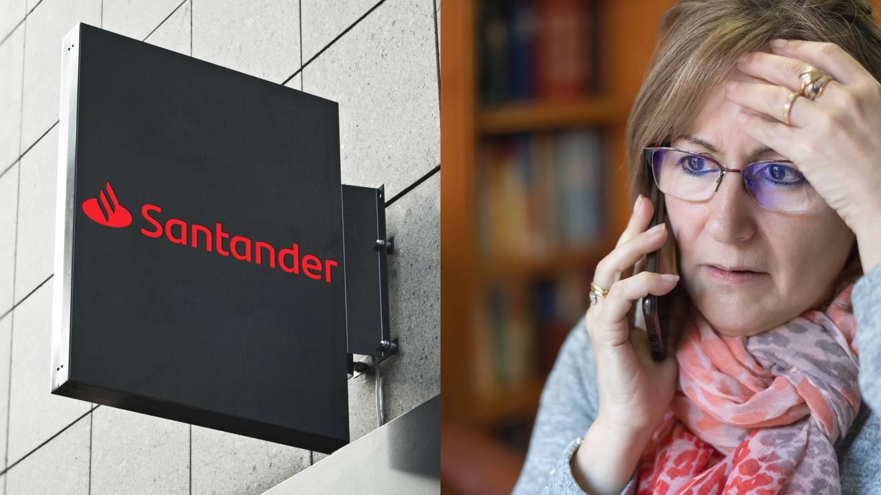 Nesta foto ilustrativa, a fachada do Banco Santander e Mulher branca falando ao telefone e recebendo más notícias com uma expressão preocupada - Créditos: depositphotos.com / josemiguelsangar - Créditos: depositphotos.com / rafapress
