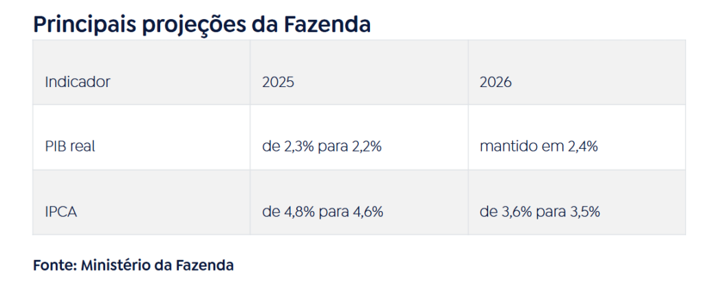 De acordo com a pasta, a revisão reflete o desempenho mais fraco da economia no terceiro trimestre e os efeitos defasados da política monetária restritiva. Para 2026, a estimativa de crescimento foi mantida em 2,4%.