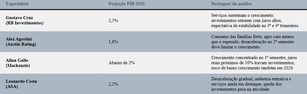 Os especialistas convergem no ponto em que a economia deve crescer em torno de 2% em 2025, mas com trajetória de desaceleração no segundo semestre. O consumo das famílias segue sustentando a atividade, porém a queda dos investimentos e os juros altos impõem limites ao crescimento.