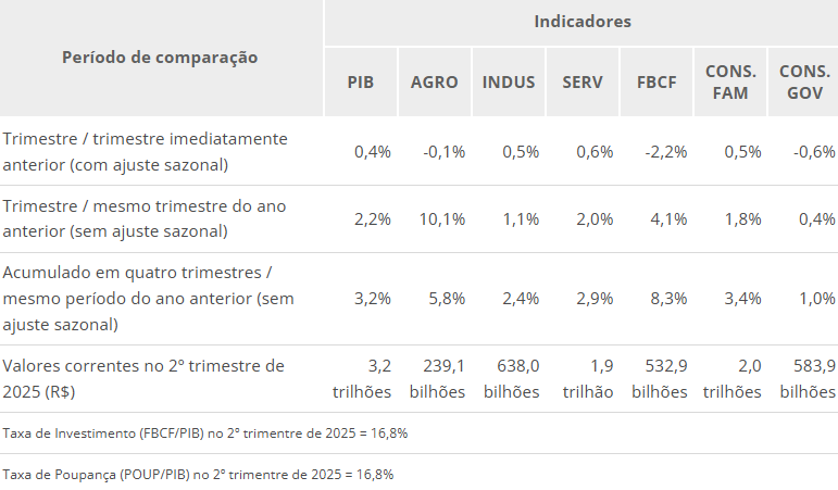 Na comparação com o segundo trimestre de 2024, o PIB cresceu 2,2%. O resultado foi impulsionado pela Agropecuária (10,1%), pela Indústria (1,1%) e pelos Serviços (2%). No acumulado de quatro trimestres, a alta foi de 3,2%.