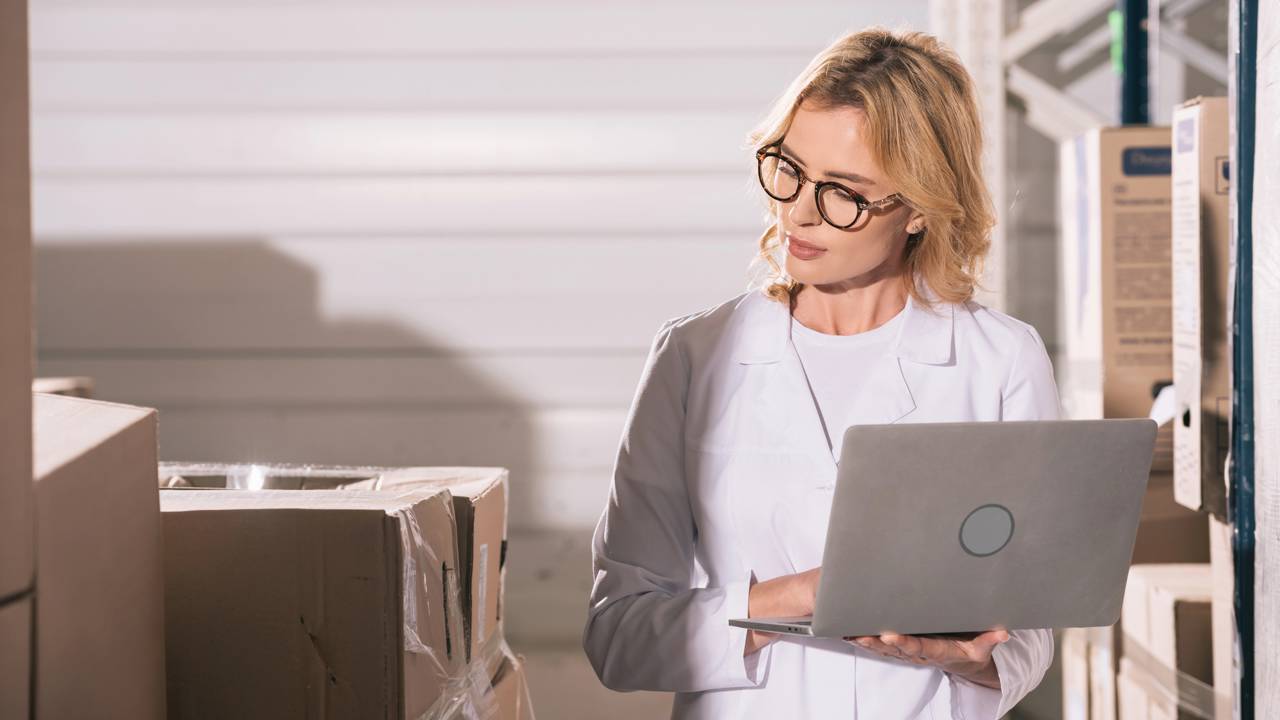 Estoquista concentrado usando laptop enquanto observa caixas de papelão no depósito - Créditos: depositphotos.com / IgorVetushko