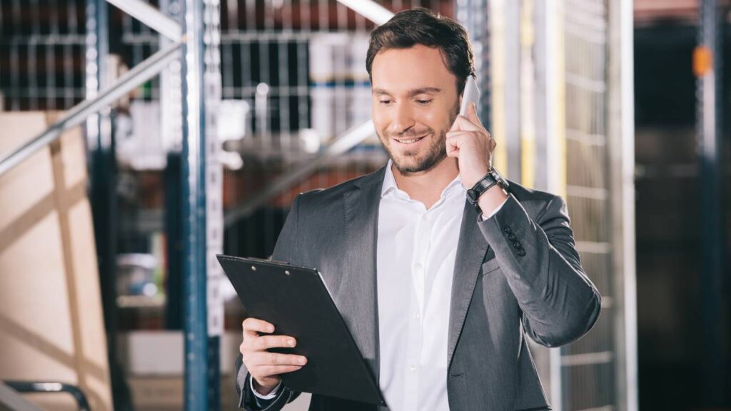 Homem de negócios sorridente falando ao smartphone e olhando para uma prancheta em um armazém – Créditos: depositphotos.com / IgorVetushko