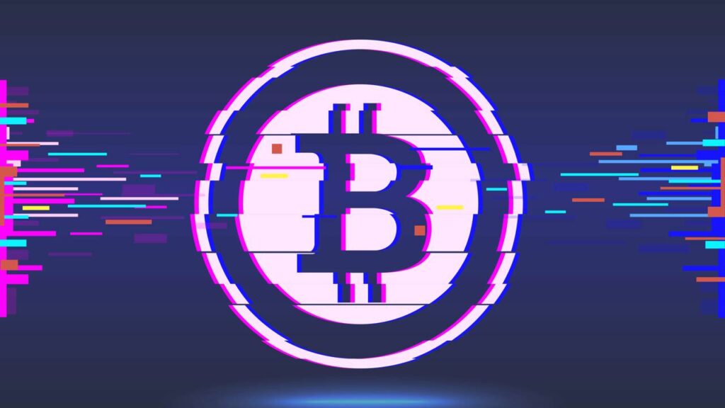 Moeda digital Bitcoin. Design com efeito glitch, fundo abstrato. Fundo de rede cibernética – Créditos: depositphotos.com / PanAndrii