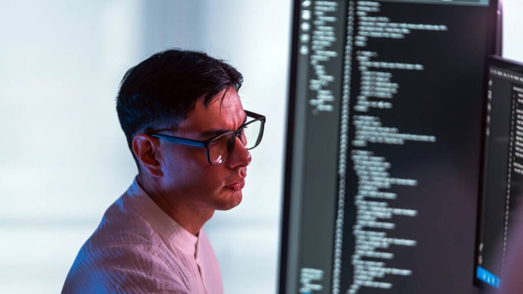 Desenvolvedor e programador focado trabalha em uma estação de trabalho moderna, codificando e depurando software em dois monitores – Créditos: depositphotos.com / artitwpd