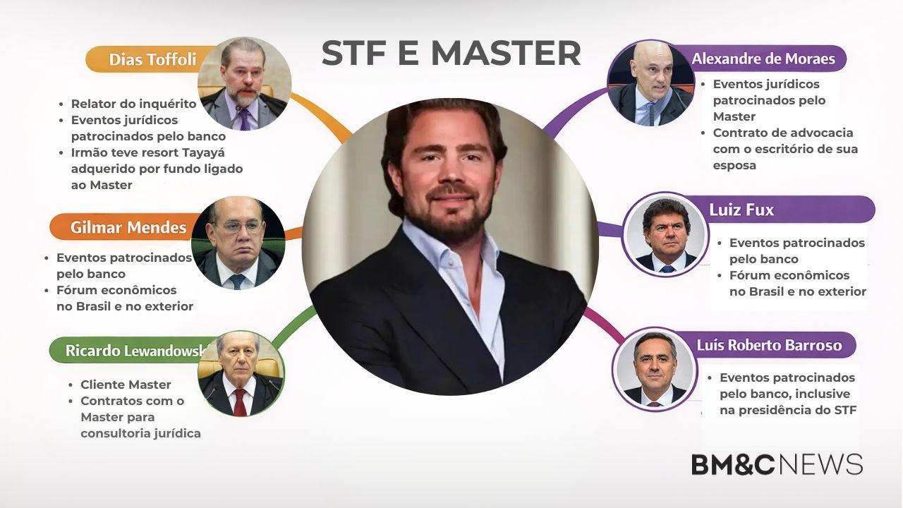 Um dos aspectos mais sensíveis do caso Banco Master envolve as relações institucionais mantidas pela instituição e por seu controlador com integrantes do Supremo Tribunal Federal (STF). O inquérito que apura as fraudes corre na Corte, sob o argumento de que há autoridades com foro privilegiado citadas em diferentes frentes da apuração.