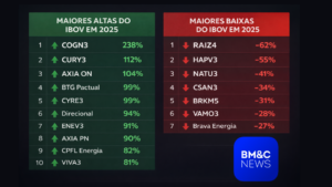 Também figuraram entre as maiores baixas a Braskem (BRKM5), com queda de 31%, em meio a incertezas societárias e um ciclo petroquímico desfavorável; a Vamos (VAMO3), que recuou 28%, penalizada pela sensibilidade a juros; e a Brava Energia (BRAV3), com baixa de 27%, em um cenário de volatilidade do petróleo e desafios operacionais.