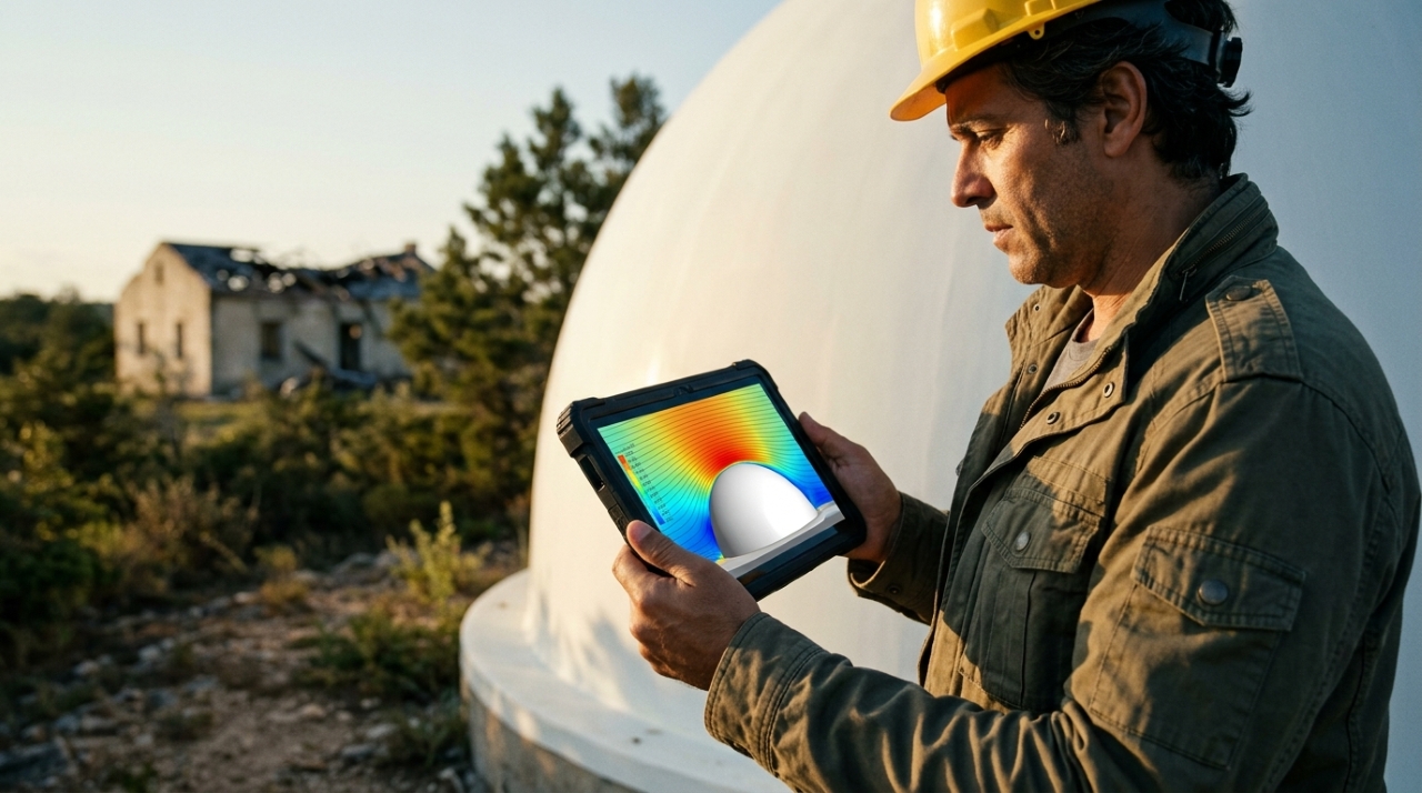 O grande segredo estrutural desta arquitetura reside estritamente na sua geometria. A dupla curvatura da casca esférica distribui qualquer carga aplicada ao longo de toda a superfície, evitando a concentração de força mecânica em cantos ou paredes planas vulneráveis.