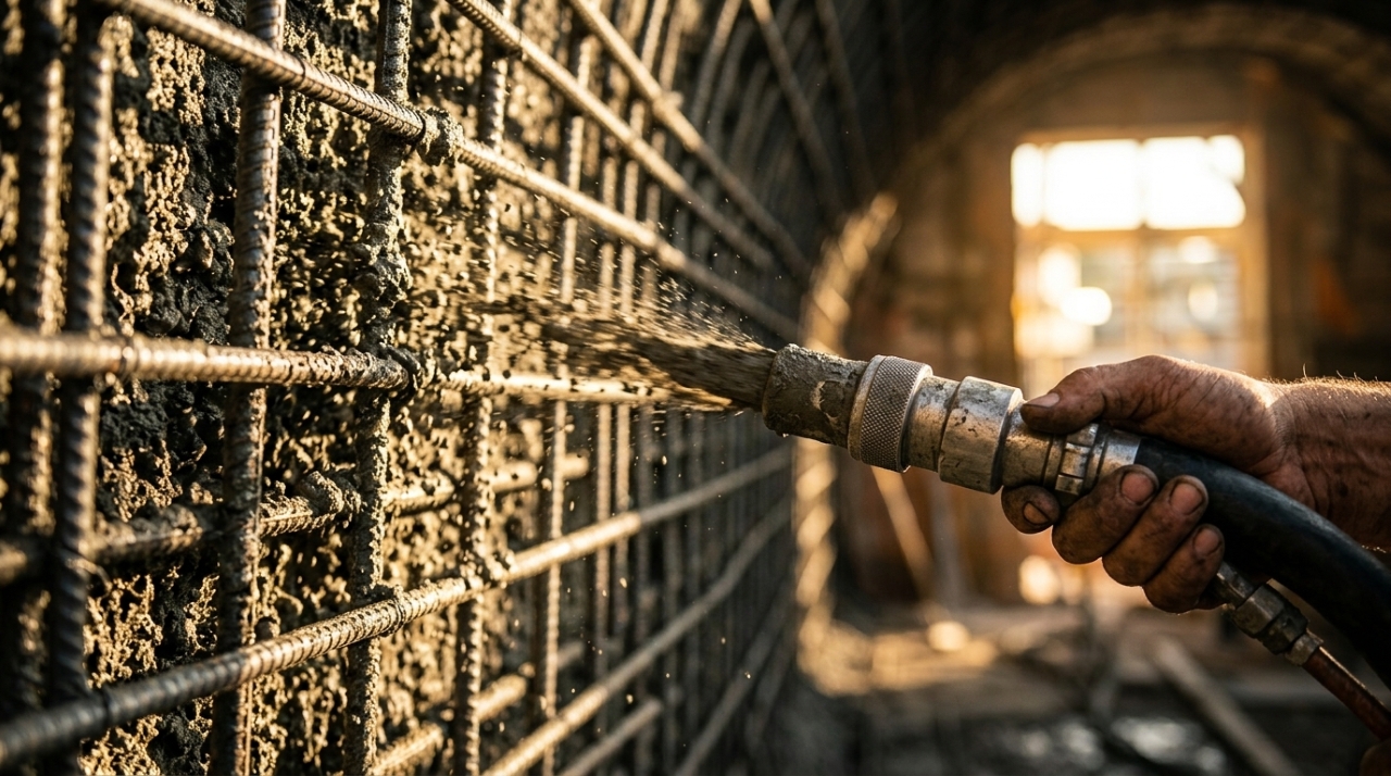 - Armação de aço e shotcrete: barras metálicas são fixadas na espuma e recebem o concreto projetado sob alta pressão até atingirem a espessura estrutural definitiva.