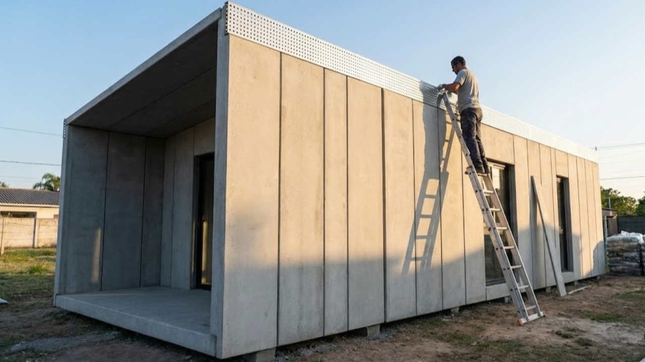 Os painéis têm larguras padronizadas de 65 e 85 centímetros e altura de 265 centímetros. Eles são posicionados sobre uma base do tipo radier, com escoramento provisório até a amarração final. As juntas de cerca de 10 milímetros acomodam dilatações ou retrações do conjunto. O travamento superior é feito com uma chapa metálica perfurada parafusada ao longo de todo o perímetro, integrando as paredes e estabilizando a estrutura.