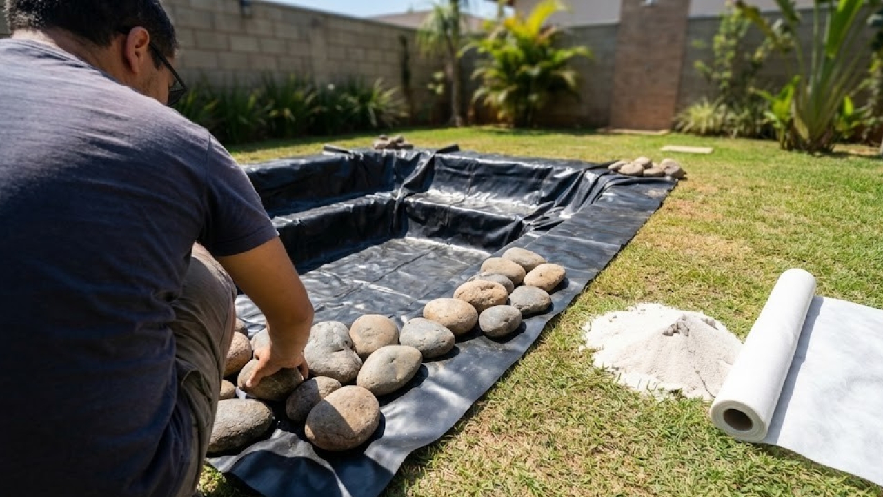 A execução segue uma lógica de camadas. Após escolher o local, escave o formato desejado, criando degraus para as plantas. Instale a manta impermeabilizante cobrindo toda a cavidade com sobras nas bordas. Posicione as pedras e seixos para travar a lona e formar o fundo estético. Encha com água e introduza as plantas aquáticas.