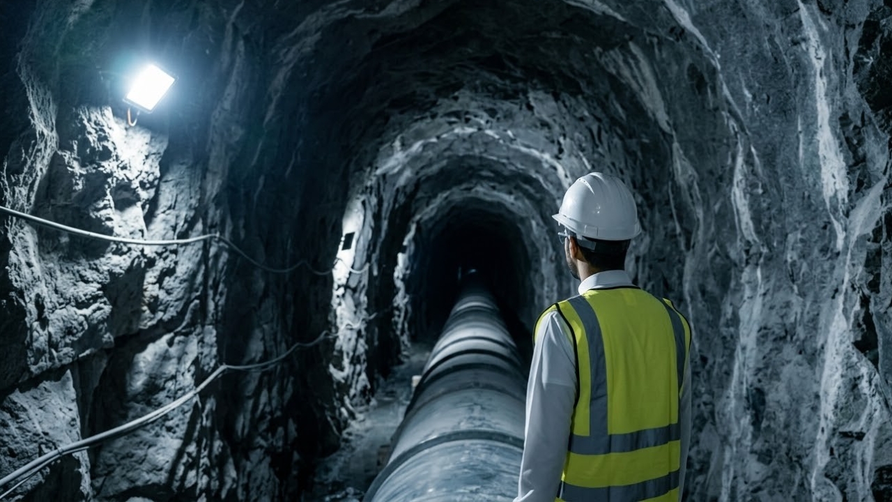 A engenharia venceu a montanha escavando o maior túnel de adutora do mundo, com 12,5 quilômetros abertos diretamente em granito maciço através de detonações controladas. Esse atalho cirúrgico encurtou o trajeto em 40 quilômetros e exigiu a construção de 47 estações de bombeamento pesadas para empurrar o volume d’água ladeira acima.