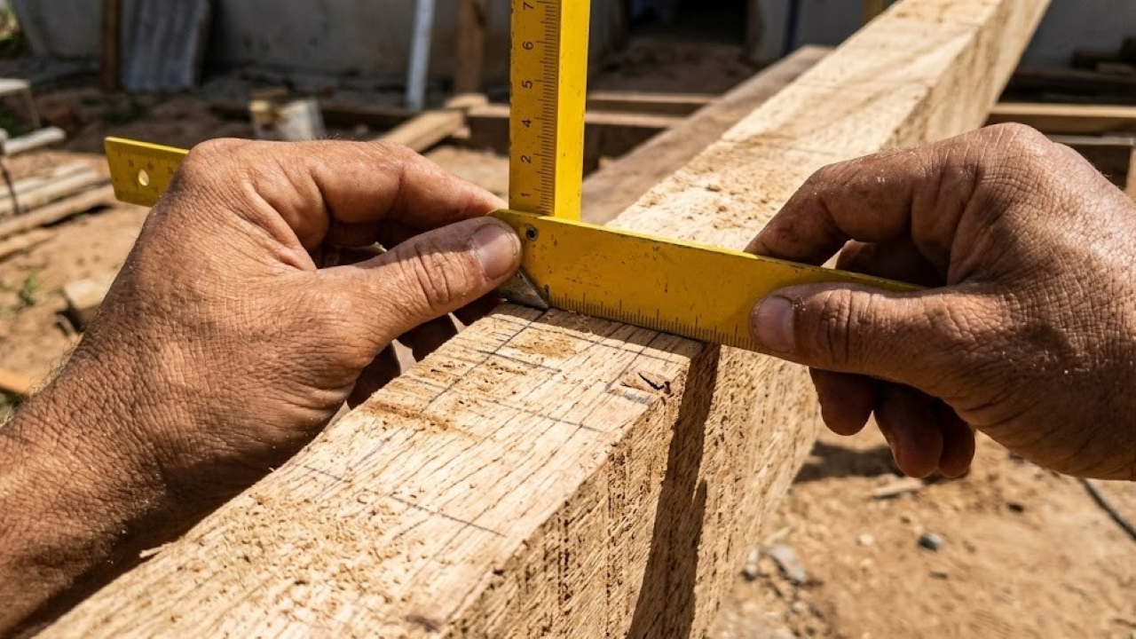 O esquadro apareceu como o primeiro grande desafio. Acertar o esquadro significa garantir que todos os cantos estejam perfeitamente retos, com ângulos de 90 graus. Se o retângulo da base nasce torto, o problema se multiplica: o telhado não encaixa, as paredes ficam desalinhadas e a caixaria das portas e janelas exige correções infinitas.