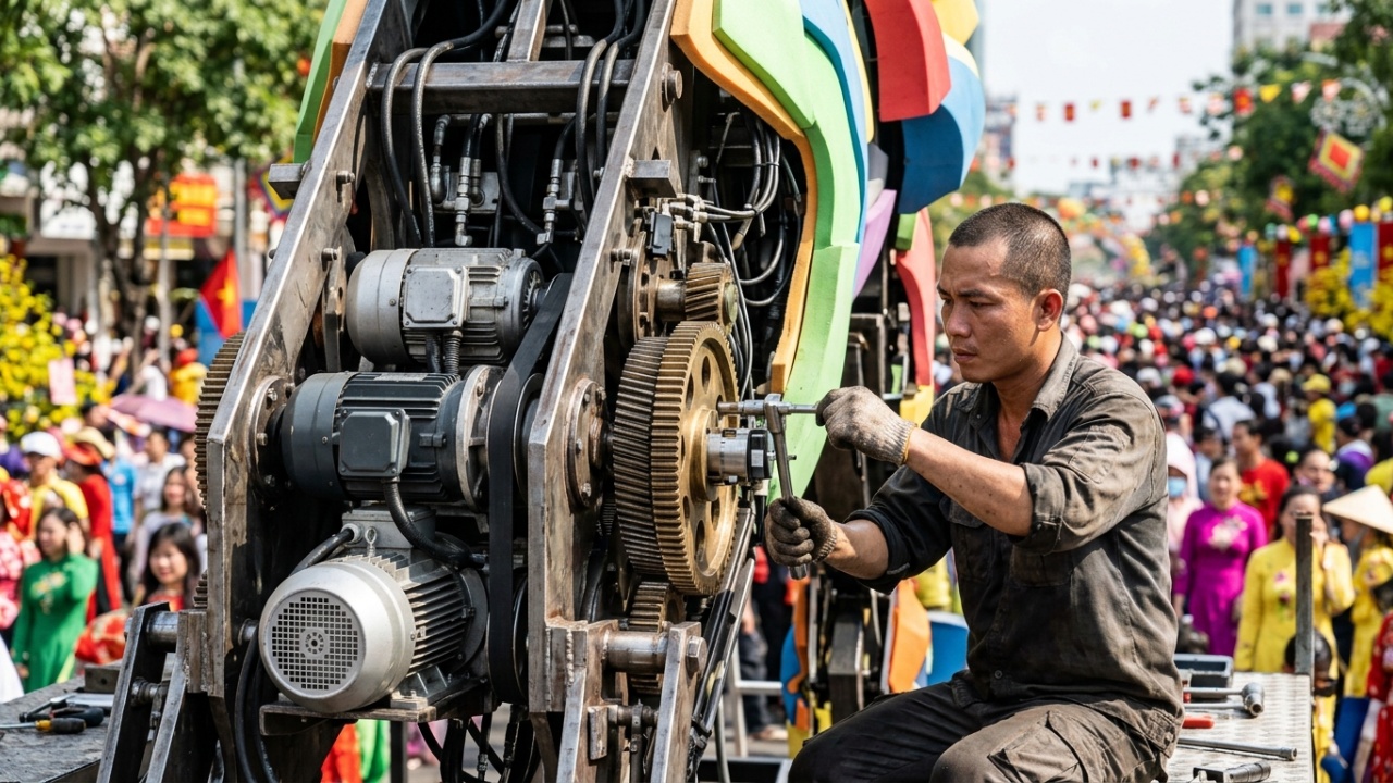 Esses robustos motores industriais permitem o ajuste flexível da velocidade dos passos durante a concorrida exibição na praça lotada. A tabela abaixo detalha as dimensões assustadoras e a real capacidade técnica que o maquinário sustenta diariamente sob o forte calor de Ho Chi Minh:
