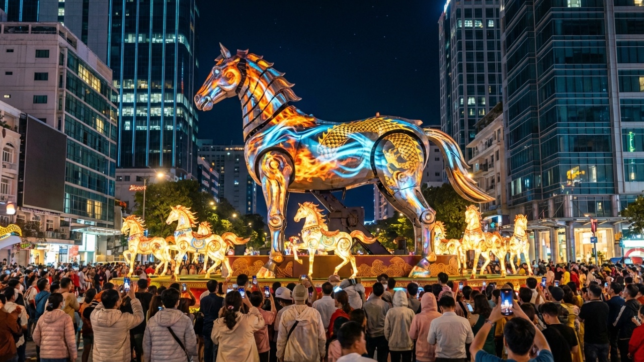 Durante as noites quentes, o cavalo gigante fabricado pelo ateliê Van Tong Fine Arts recebeu efeitos impressionantes de mapeamento 3D projetados diretamente sobre o seu corpo robusto. Para completar o cenário mágico idealizado para celebrar o Ano do Cavalo de Fogo, a atração contou com a escolta cintilante de seis corcéis menores forjados pelo artista Đỗ Thế Bình, coroando o evento com absoluto sucesso estético e comercial.