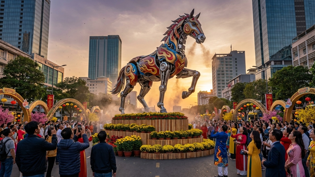 A famosa Avenida Nguyễn Huệ abriga anualmente a tradicional e colorida Rua das Flores para celebrar o badalado festival do Tết no Vietnã. No ano de 2026, a grandiosa festividade comemora a chegada do astrológico Ano do Cavalo de Fogo com o tema Primavera Reunida, exigindo uma decoração central absolutamente espetacular para representar a força inabalável do povo vietnamita.