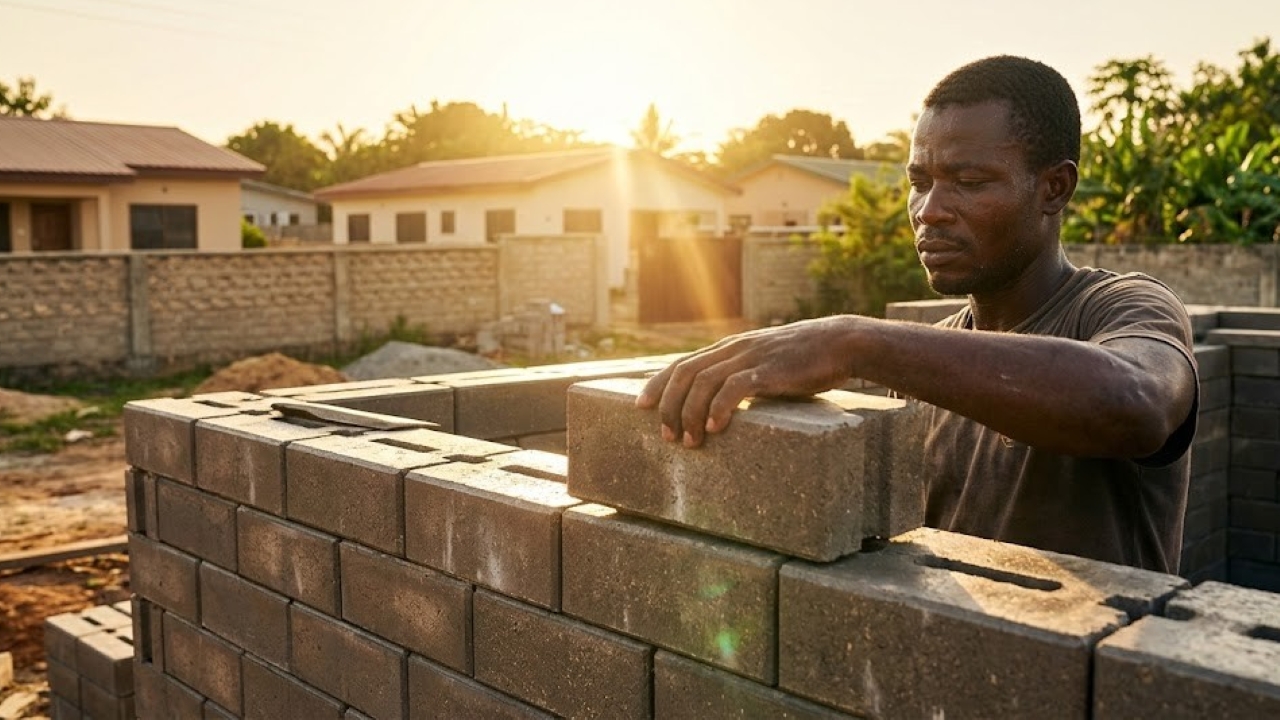As máquinas conseguem produzir 25 tijolos por hora. O design inclui ranhuras e um buraco no meio, pensados para dificultar a entrada de calor. Isso é especialmente importante em Accra, onde o conforto térmico em casa faz toda a diferença.