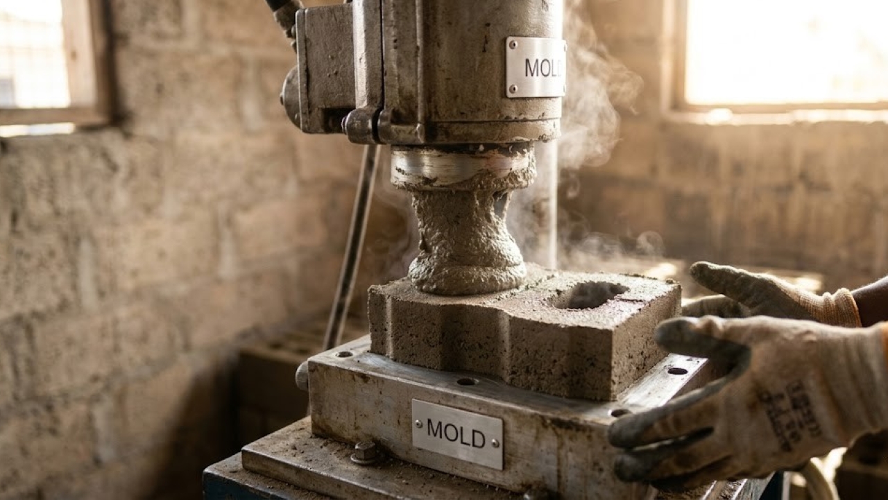 Em seguida, ele é misturado com areia, formando uma pasta prensada em moldes até virar tijolo