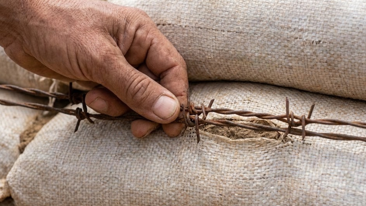 Entre uma fiada e outra, fios metálicos se estendem sobre os sacos já comprimidos. Quando a próxima camada é colocada, o fio fica prensado, travando o conjunto. Essa amarração mecânica impede o deslizamento lateral e aumenta a coesão da parede.