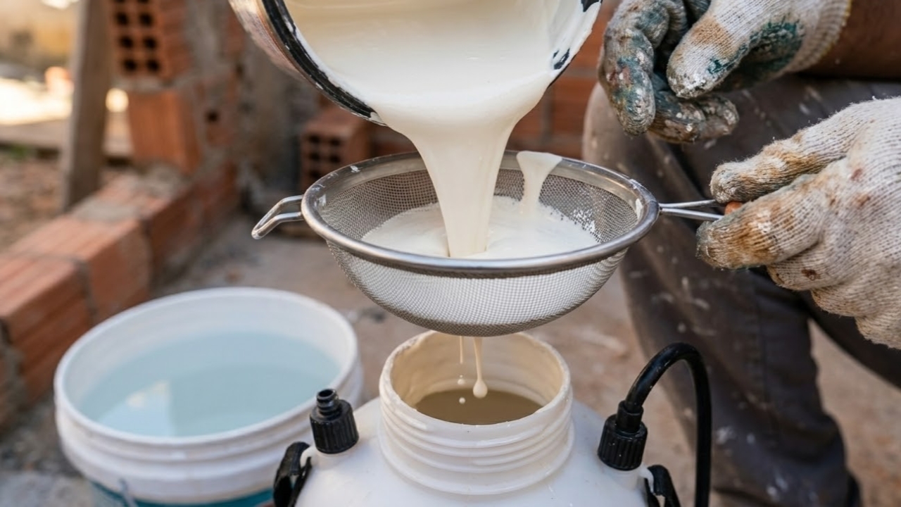 Apesar de toda a praticidade da ferramenta, o segredo do sucesso mora na etapa de preparo do líquido dentro do galão. É absolutamente obrigatório peneirar muito bem o produto antes de colocá-lo no reservatório, evitando que grumos secos entupam a saída de ar da máquina.
