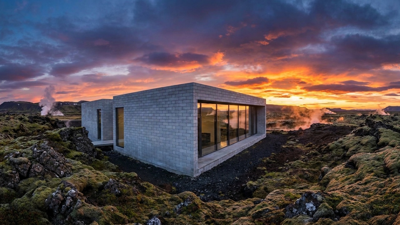Casa minimalista de blocos sílico-calcários integrada à paisagem da Islândia