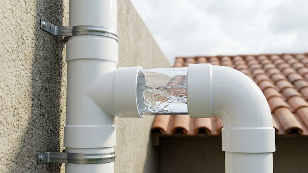 A estrutura utiliza o tubo de esgoto convencional de cem milímetros para garantir uma vazão de água adequada mesmo em tempestades fortes. Esse diâmetro maior é essencial para evitar gargalos no escoamento e reduzir drasticamente as chances de entupimentos causados por sujeira acumulada. A água que atinge o telhado é direcionada diretamente para o reservatório através dessa tubulação robusta e resistente.