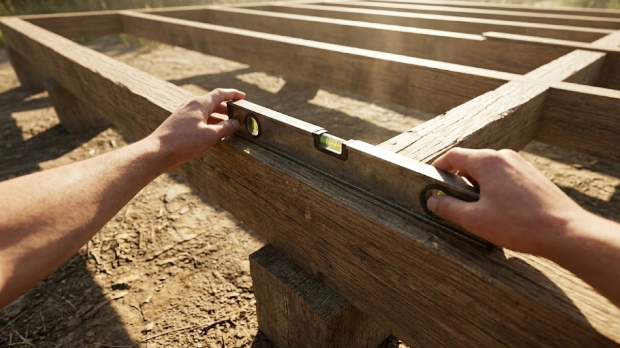 Sobre esses blocos, vigas de madeira grossas foram alinhadas paralelamente, conectadas por travessas transversais que formam uma grade rígida. O nivelamento é feito manualmente, com ajustes constantes para garantir que cada viga permaneça perfeitamente alinhada antes da fixação definitiva. É o primeiro passo para a base deixar de ser apenas apoio e se tornar parte ativa da engenharia da casa.