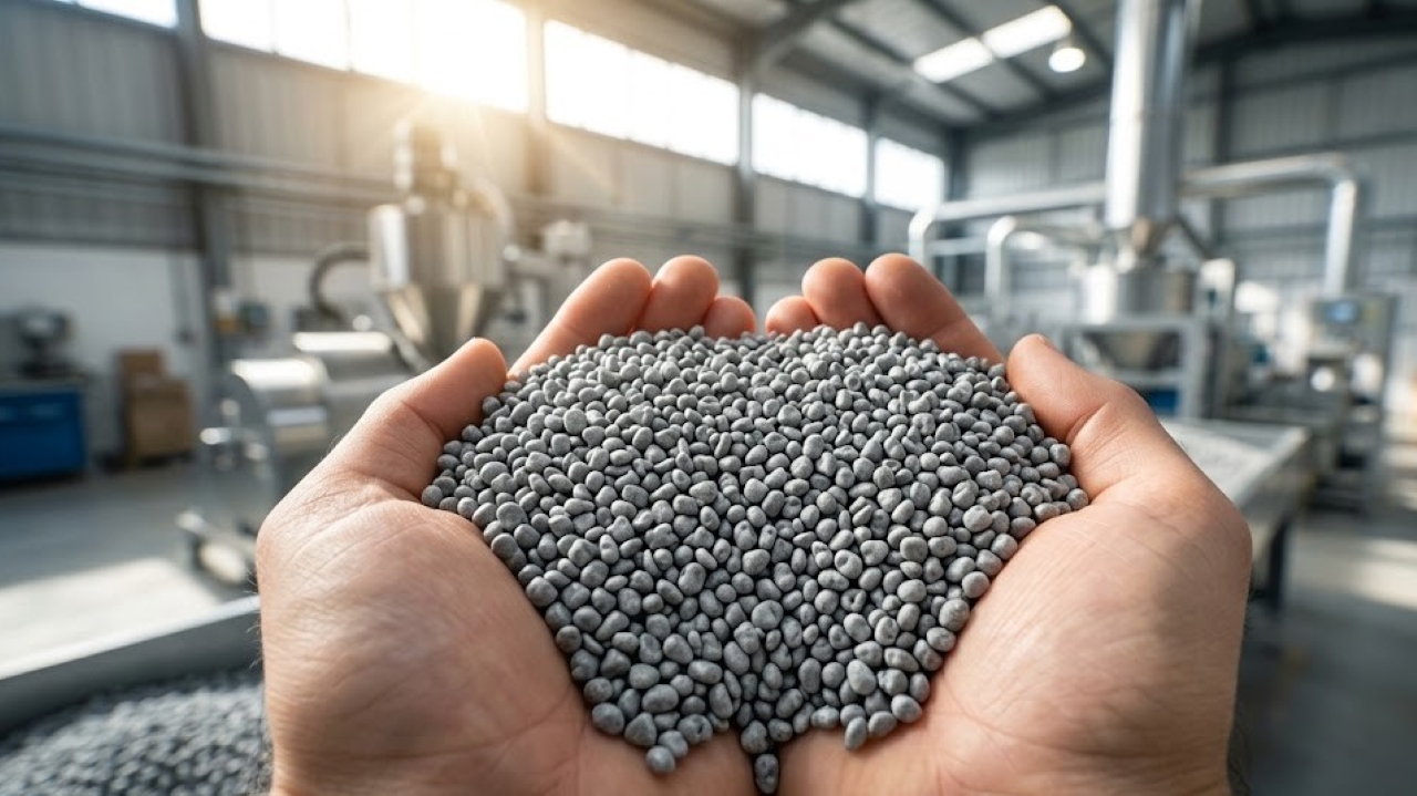 Desenvolvido pela CRDC Global, o RESIN8 é um eco-agregado patenteado que substitui parte da brita e da areia no concreto convencional. O processo começa com a granulação de qualquer tipo de plástico, mesmo aqueles sujos, misturados ou contaminados que as recicladoras tradicionais rejeitam, como embalagens multilaminadas, sacolas, isopor e canudos.